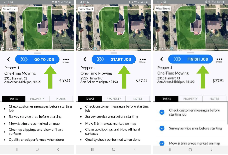 Pro Tip: If you are servicing a property near your next LawnGuru customer, please be sure to swipe "Go To Job" at least 5 minutes before starting the service to allow the customer enough time to prep their service area or skip if needed.
