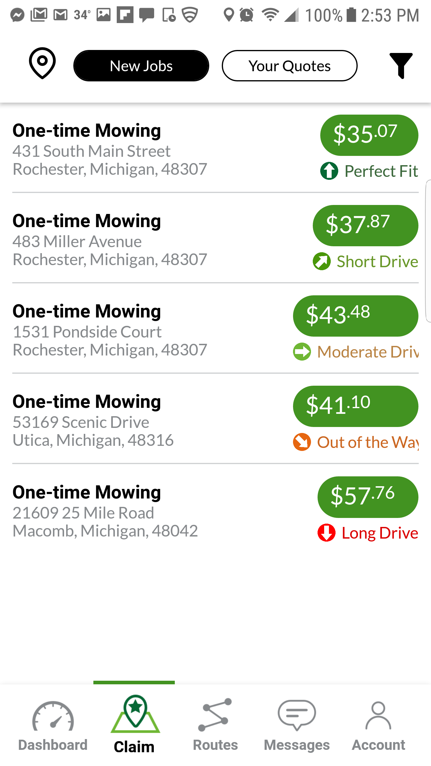Our goal is to maximize your route density and minimize waste. To do this, we score every job just for you so you can optimize your routes naturally. Try to pick up jobs that are “Best” or “Good” fits for your routes and avoid jobs that are bad fits. The more you use LawnGuru, the more valuable these scores become.